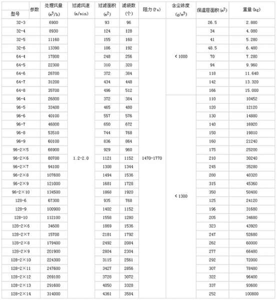 本系列產品共有33種規(guī)格,每室的袋有32、64、96、128袋四種,濾袋長度有2450mm和3060mm兩種,收塵效率可達99.9%以上,凈化后氣體的含塵濃度小于100mg/m3(標)本系列收塵器如用于寒冷地區(qū),當室外采暖計算溫度≤-25℃時,要設熱裝置。